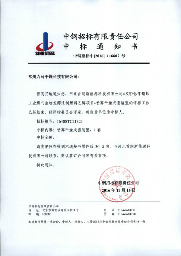 經(jīng)過(guò)公開(kāi)招標,首鋼公司發(fā)酵廢液的深化處理,轉化成蛋白飼料用特大型噴霧干燥機組,^終定標,在眾多的參與投標的入圍企業(yè)中,力馬企業(yè)一舉中標,中標金額巨大。