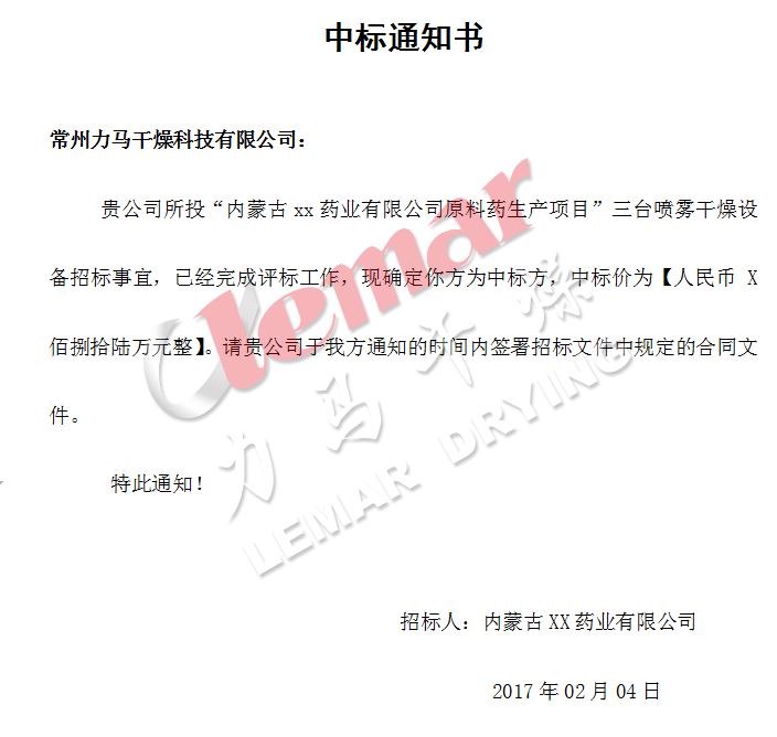經(jīng)過(guò)廣泛的調研和嚴格的測驗,內蒙古xx藥業(yè)有限公司,^終決定向常州力馬科技有限公司定購三臺原料藥噴霧干燥機,單筆金額高達百萬(wàn)余元,貢獻力馬新春第一單,為力馬贏(yíng)得了農歷雞年的頭彩。同時(shí)也展示了內蒙古xx藥業(yè)有限公司蓬勃的生機和迅猛的發(fā)展勢頭,真誠祝愿兩家公司合作愉快、雞年大吉。