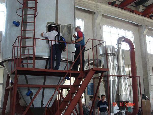 中藥浸膏是由植物根莖葉提取而成,特別是醇提工藝,它含糖份較高,在高溫下易軟化熔融,普通的離心噴霧已無(wú)法滿(mǎn)足干燥,針對這種情況我公司組織了一批精干的技術(shù)力量,總結出幾年來(lái)本廠(chǎng)設計制造噴霧干燥機的成功經(jīng)驗,收集了國內外同行業(yè)同類(lèi)型產(chǎn)品的優(yōu)點(diǎn),經(jīng)過(guò)精密、反復的工藝計算和無(wú)數次的實(shí)驗,開(kāi)發(fā)出了中藥專(zhuān)用噴霧干燥機組,并推廣到了一些知名藥廠(chǎng)使用。